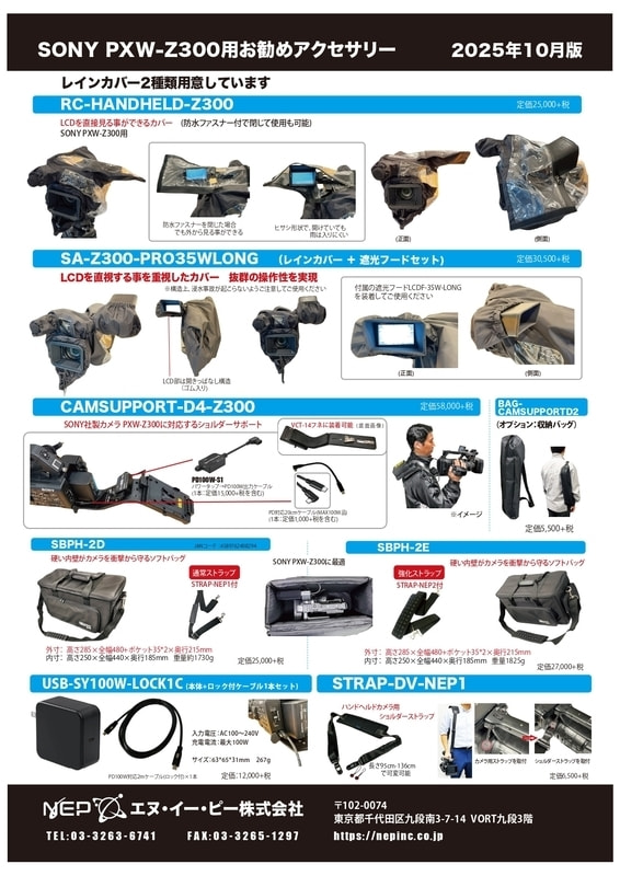 月曜-金曜9:15-18:15(休業:土日祝日) 日本語サイト ENGLISH SITE 官公庁様向け 製品一覧PRODUCTS 製品一覧を見る バッテリー 充電器 電源関係アクセサリー ケーブル関係 レインカバー カメラ液晶用遮光フード・ウインドジャマー等 バッグ・ケース関係 カメラシュー・アーム等 固定金具関係 LEDライト 乾電池・充電式電池 関係 メンテナンス関係商品 記録メディア関係商品 各メーカー向け対応商品 ZGCINE SmallRig カタログ各種CATALOGUE WEBカタログ カタログ一覧を見る カタログを請求する お知らせNEWS お知らせ一覧を見る サポートSUPPORT サポート一覧を見る バッテリー輸送資料(MSDS) 輸出用該非判定書 バッテリー廃棄について USB PD充電器 出力表 OEM生産・特注について セールSALE セール一覧を見る セール品(NEP商品) セール品(その他商品) 会社案内・採用COMPANY 会社案内 採用情報 採用応募フォーム Youtube・SNS HOME | 製品一覧 | 各メーカー対応商品 | SONY PXW-Z300 対応商品 SONY PXW-Z300 対応商品 SONY PXW-Z300 カメラでより良い撮影環境を生むアクセサリーを用意 SONY PXW-Z300用お勧め機材カタログ(PDF) RC-HANDHELD-Z300 レインカバー SONY PXW-Z300用 (LCD直視可能・防水ファスナー付) 標準価格:¥25,000(税抜) SA-Z300-PRO35WLONG レインカバー SONY PXW-Z300用 (遮光フード付LCD直視可能タイプ) 標準価格:¥30,500(税抜) SONY PXW-Z300用ACアダプター USB-SY100W-LOCK1C (USB100W本体+ロック付ケーブル) 標準価格:¥12,000(税抜) SBPH-2D ソフトバッグ 標準価格:¥25,000(税抜)